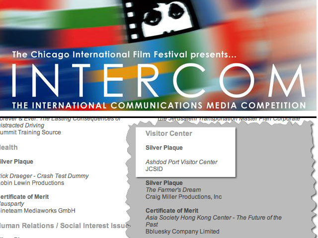 I’m very proud to announce that the Ashdod Port Visitor Center got a Silver Plaque in the category “Visitor Center” at INTERCOM 2012, part of the Chicago International Film Festival.